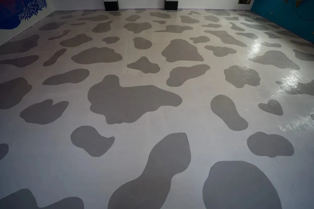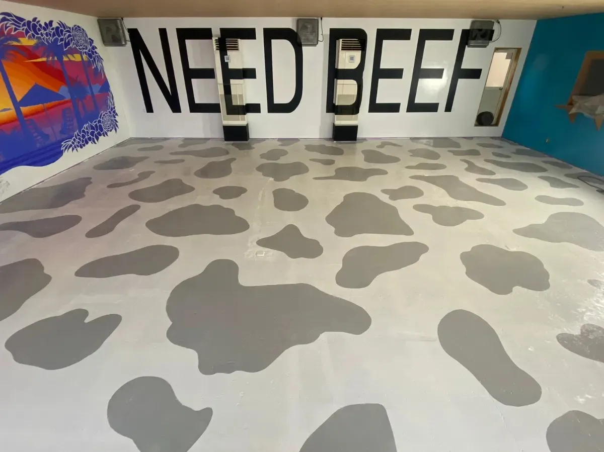 淡路島にある焼肉店「まほろば」の店舗改装に伴い、床一面に牛柄のペイント、