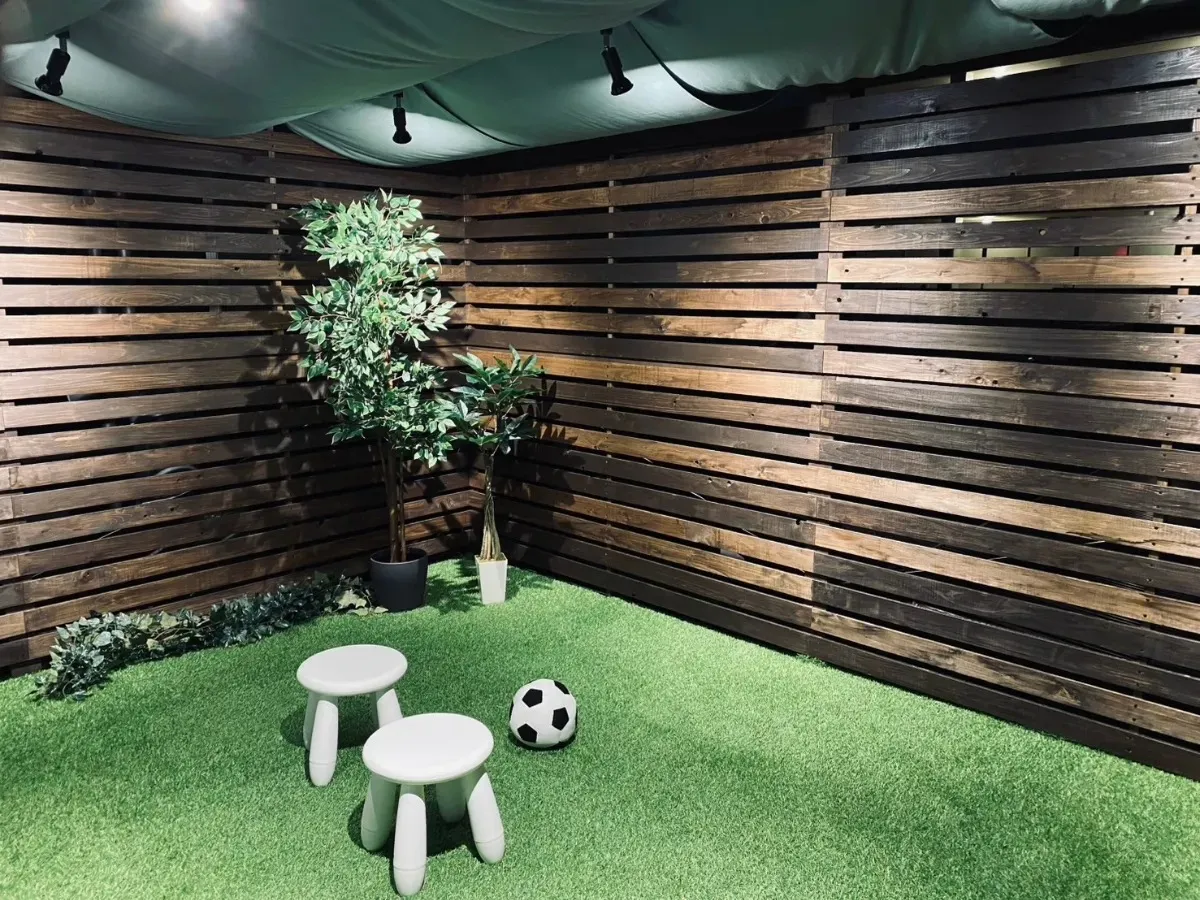 卓を囲みながらBBQを楽しめるエリアとキッズエリアを店舗ブランドの高級感を表現しつつながら融合させることで、ターゲットであるファミリー層でも楽しめる空間をデザインした。