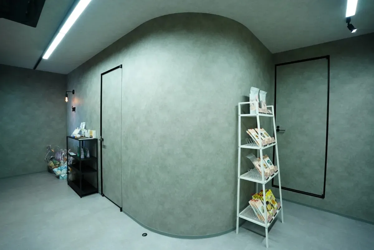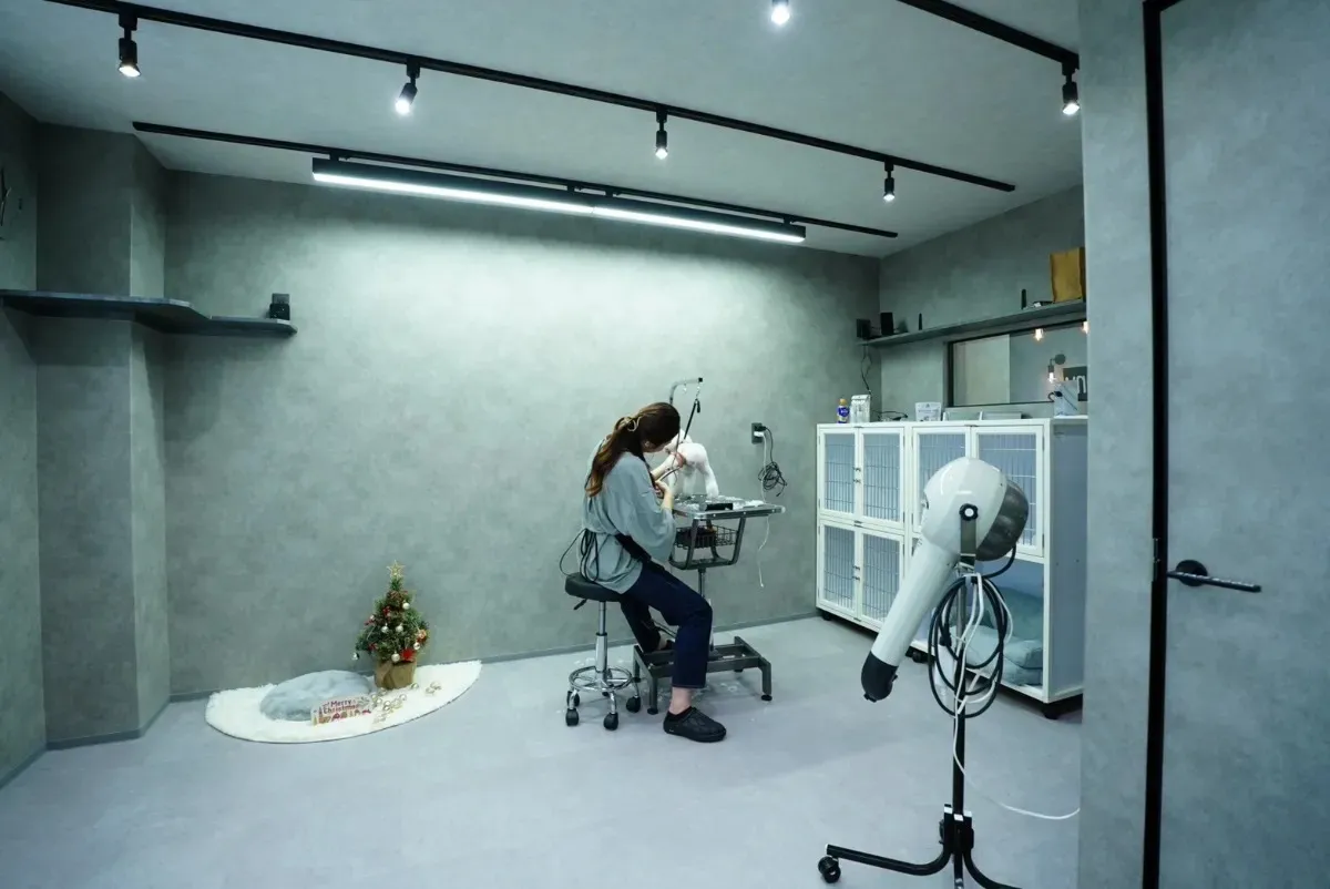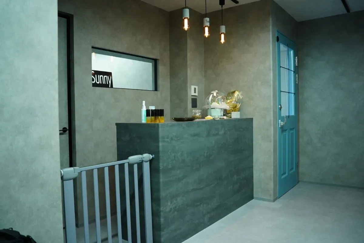 内装デザインは「コンクリート調の無機質な雰囲気」というオーナーの要望に応えつつ、犬たちが安全に過ごせるよう、角を丸く仕上げる工夫を取り入れた。洗練されたデザインの中に優しさと実用性を兼ね備えた空間を目指した。