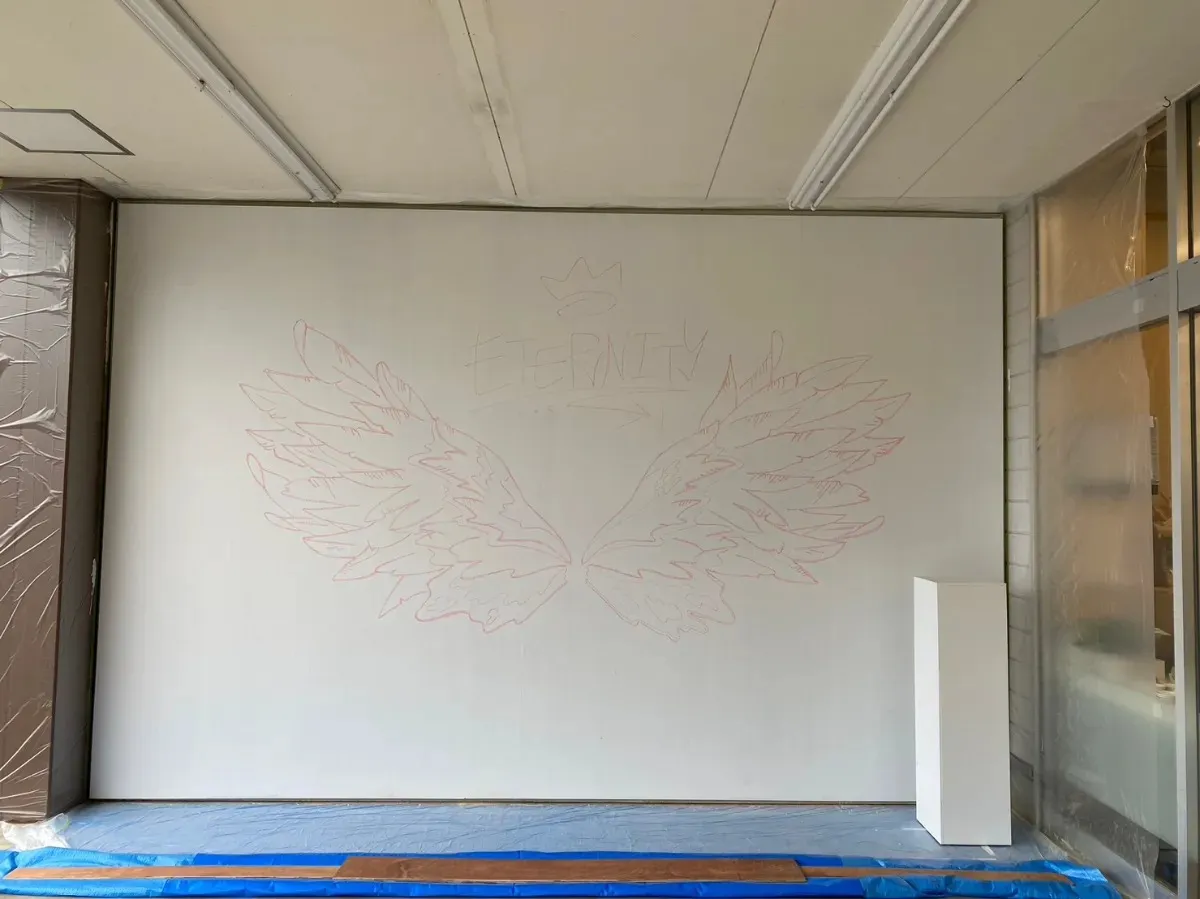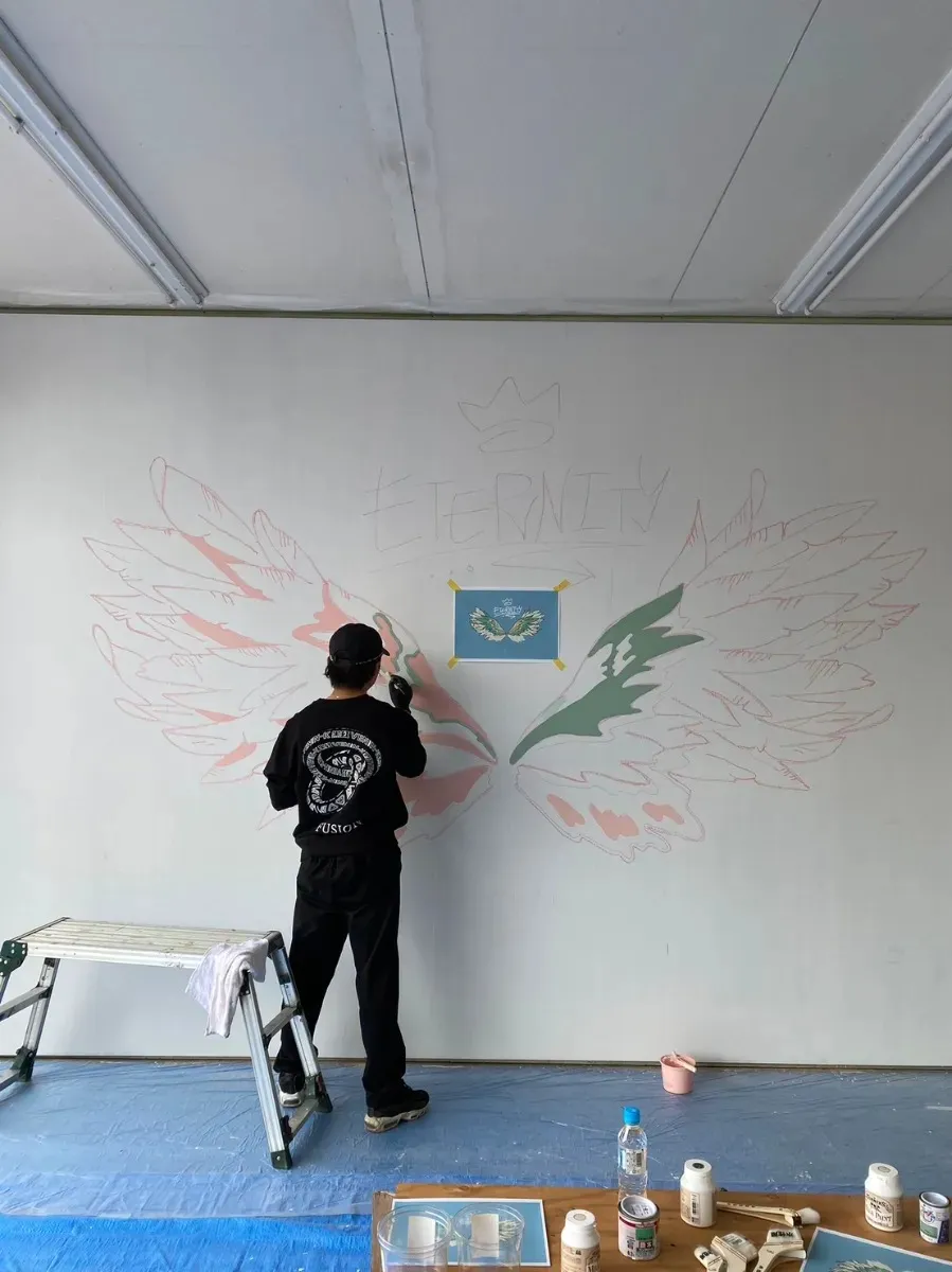 The artwork features a pair of dynamic, lifelike wings, inviting people to stand in front of them as if about to take flight. The use of soft pastel colors ensures that the mural blends harmoniously with the surrounding streetscape while remaining visible from the road. This gentle color palette appeals to a wide range of age groups, making the artwork accessible and welcoming to all.